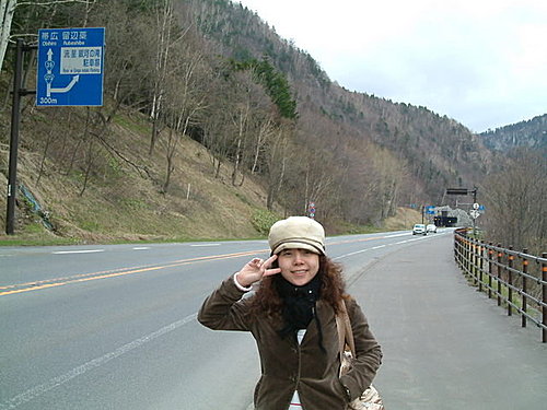 我們步行回到了巴士總站,想詢問往銀河瀑布跟流星瀑布的路徑。車站售票小姐指引我們行進方向,但我們覺得那方向很空曠,不是很明瞭的我們沿途詢問車站等車的歐巴桑、停車場的遊客及清潔人員,都不清楚瀑布的位置。奇怪,銀河&流星瀑布不是這兒的觀光旅遊景點嗎? 怎麼知道的人好像不多? 最後是問到清道夫中的一位阿桑,指引了我們方向,加上在巴士站拿的地圖及售票小姐說看到公眾廁所旁的路轉進去就是,於是踏上了步行前往瀑布的遙遠之路。怎麼說遙遠呢?因為地圖上看似很近的地方,我們走了兩公里的路後還看不到明顯地標公眾廁所在哪?旅遊書上建議租腳踏車,但放眼望去看不到出租處。加上寒風刺骨,遠方又有隧道,於是便放棄了瀑布之旅。看見一輛輛遊覽車經過,我相信瀑布的確是值得一遊,但不是靠雙腳。