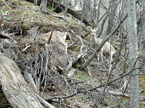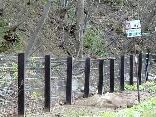 這一趟來回共走了4公里的路還到不了目的地,加上天冷,整個就是很累,但是回程途中眼尖的老公發現了有鹿群出沒,機警的鹿隻先行逃離,剩下一隻來不及回去的鹿和我們大眼瞪小眼,因為路就這麼一條,牠要回去的話必須繞過我們才能從旁邊小徑上山。可能是緊張加害怕的緣故,牠居然過到馬路另一頭然後打算加速跨越過護欄回到上面,但是護欄太高,而且牠的加速是慢速加速,於是跌倒了兩次,最後我們打算讓路讓牠過時,牠居然繞了一大圈從馬路對頭繞回到我們的身後小徑上山。鹿啊鹿,其實你離我們有段距離耶…而且我們看來很可怕嗎?居然怕到要加速跨越護欄….偶然的奇遇倒也讓漫長的路途稍添趣味。