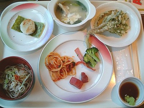 ※自助式晚餐。左上為山藥,上中為地雞湯,右上是天婦羅;左下為蕎麥麵,中為義大利麵加鮪魚生魚片。