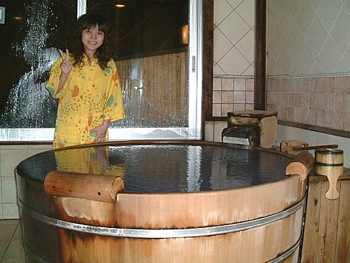 放棄了到瀑布後,步行到朝陽Resort飯店Check In,飯店離巴士站約十分鐘的腳程,由於我們的住房course是有含貸切溫泉個室,所以吃完晚餐後可至櫃台取鑰匙於預訂時間使用。但時間還早的關係,於是我們進房放下行李後,分別到大眾浴池泡湯去。這兒大眾池當然也是男女分開,進去後人不多,先淨身後再到溫泉池去泡。這兒的池有中熱、較熱、冷泉、露天兩池及烤箱可使用。露天是用木桶池,水流不斷,這兒的露天風景怡人,面對山林,泡在木桶中的感覺很讚。
